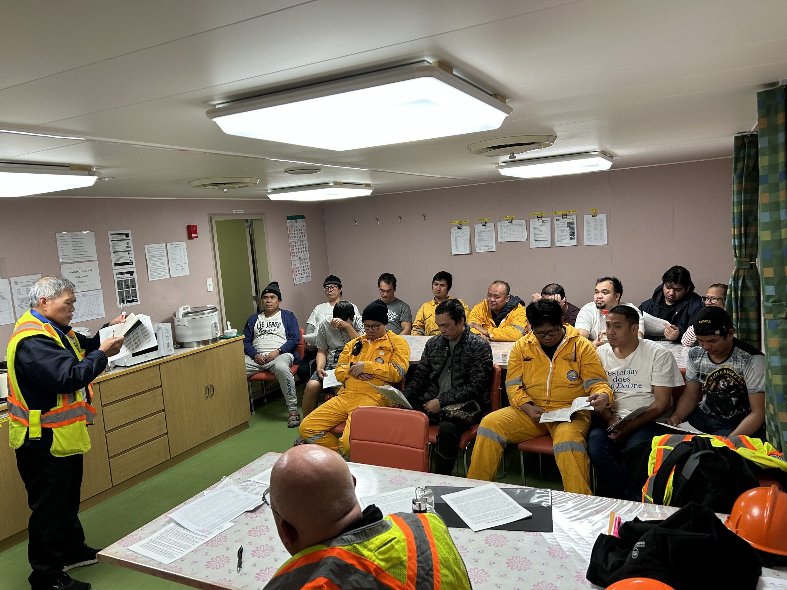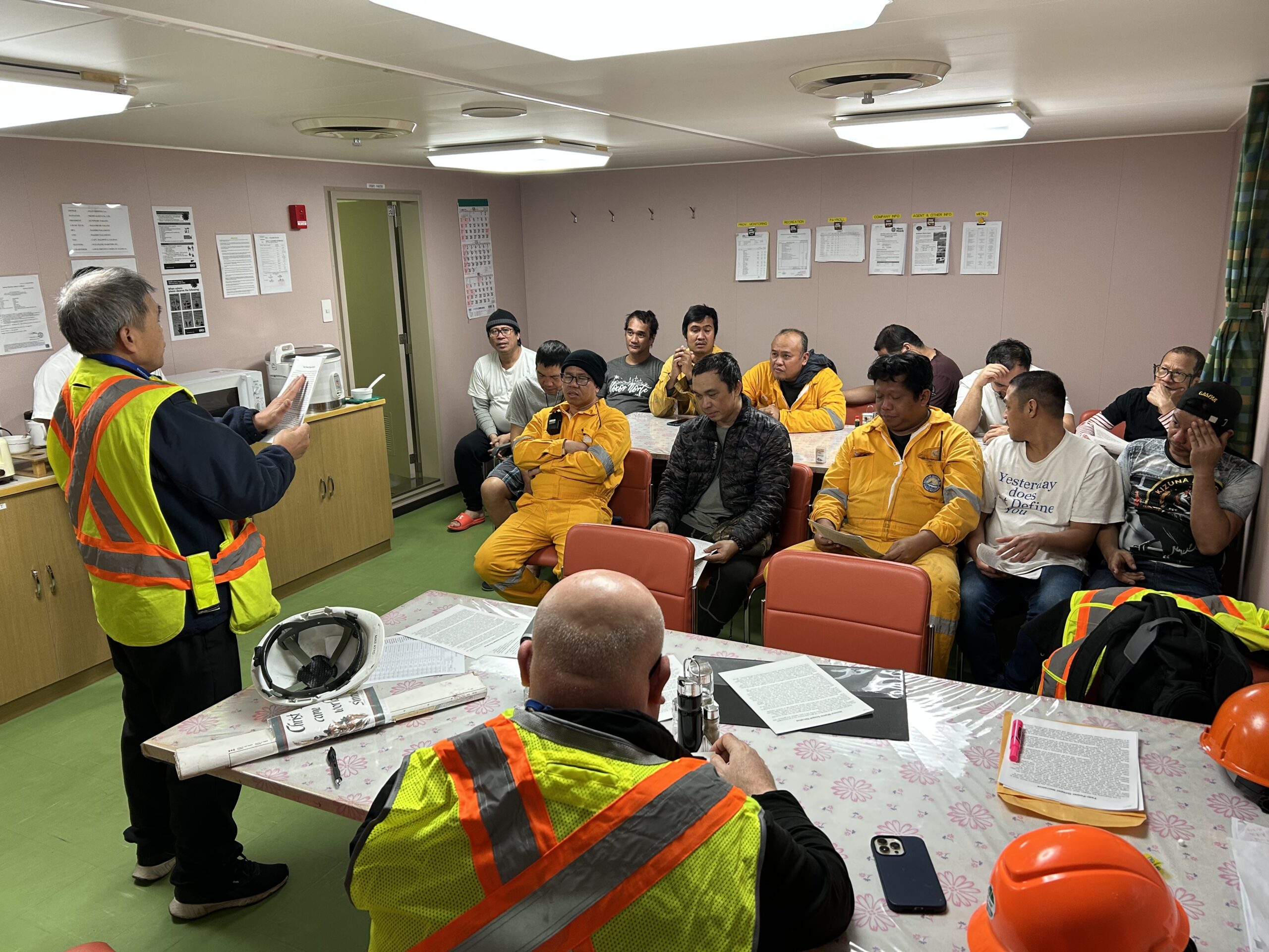 I finished work and checked through dock security then drove up to the ship. Frank and Gerard followed a few minutes later and we board the ship. The deck security officer checked us in and took us to the crew mess. Gerard was talking to several crew in the hallway and said that Chief Officer would call all available crew to come and meet us before they had dinner. Soon they came pouring into the mess and sat down in two rows.