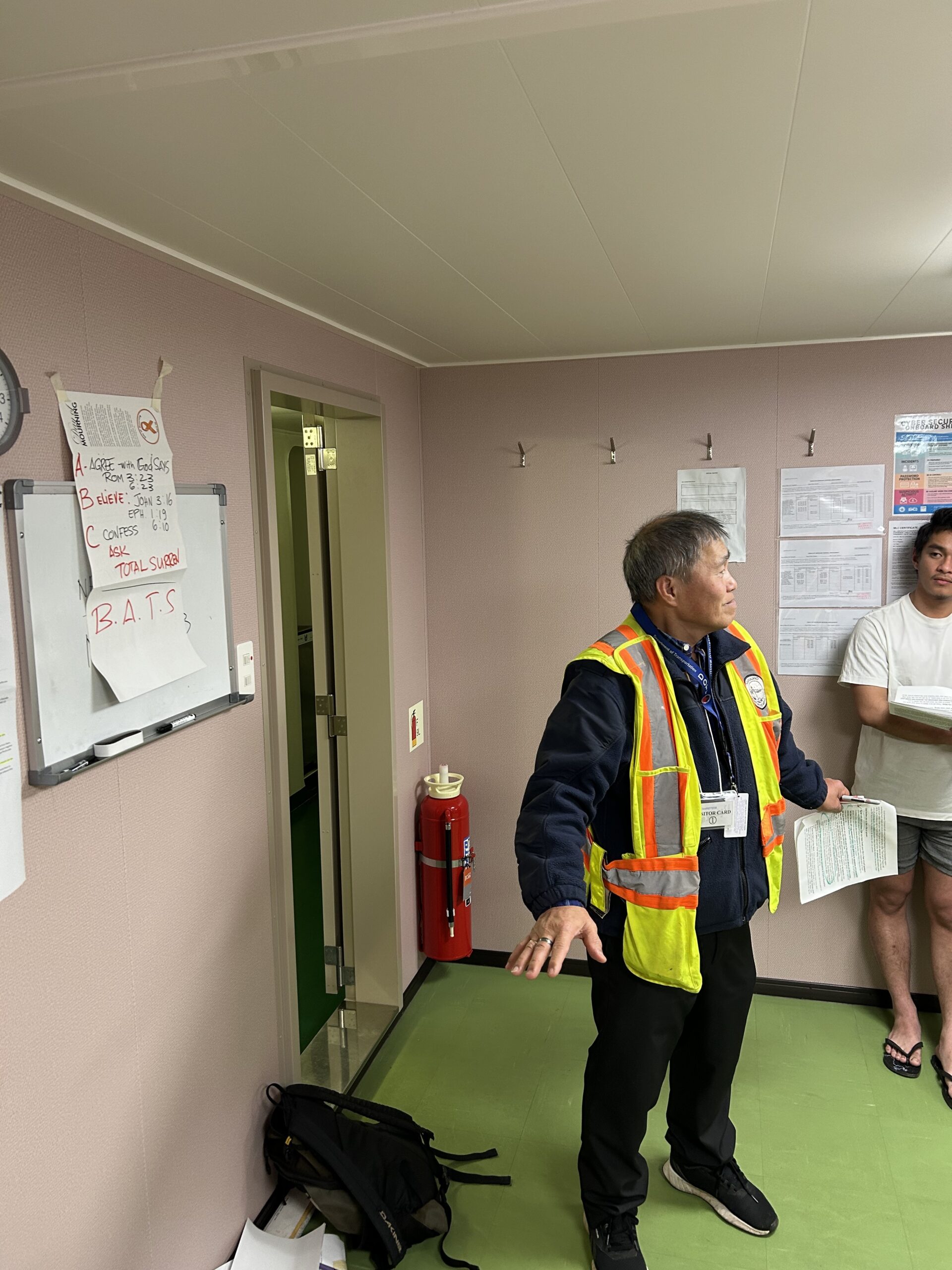 I explained that we have two different versions of the gospel: Honour-Shame and Fear-Power. They identified that the Fear-Power (ancestral worship) was most appropriate. I had initially wanted to pass out the message and have them read it and give us some feedback, but Gerard said that their reading of English isn’t very good. So Gerard had the youngest seafarer read the Fear-Power gospel to them and I realized, by how much difficulty he had with reading many of the words, that this was too hard for them to understand.