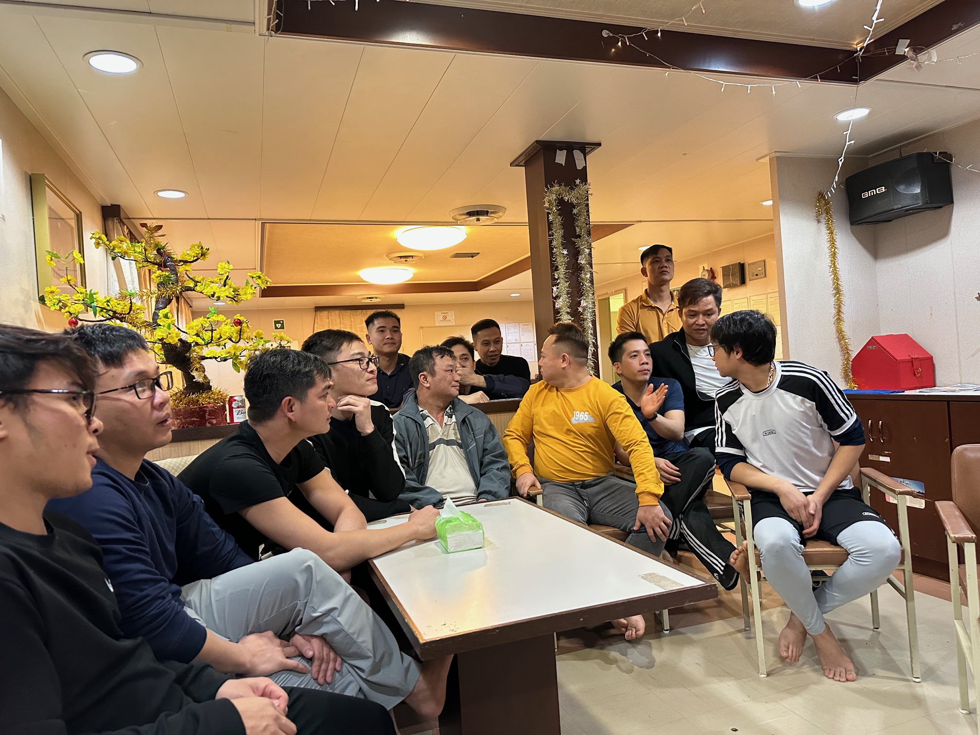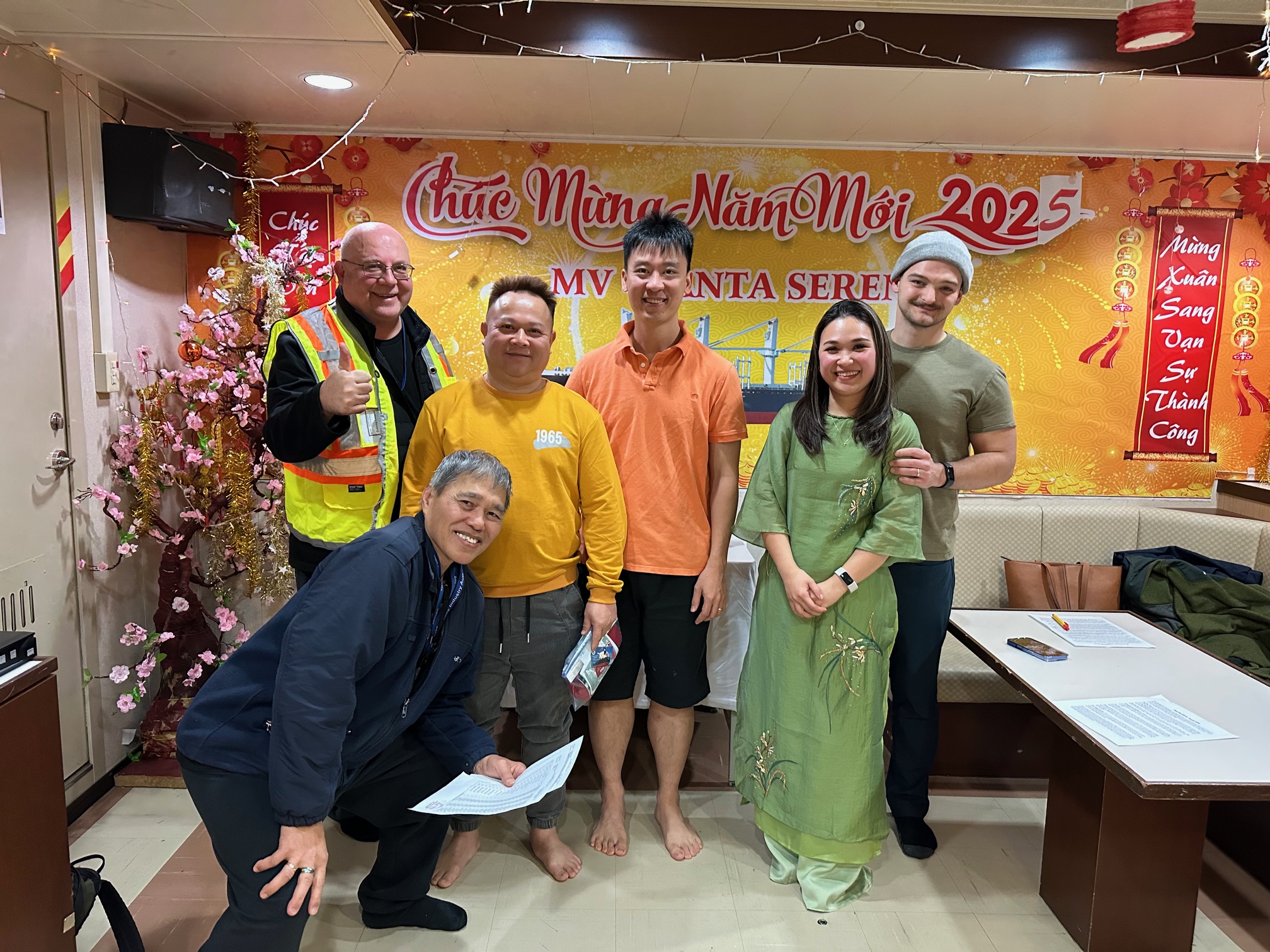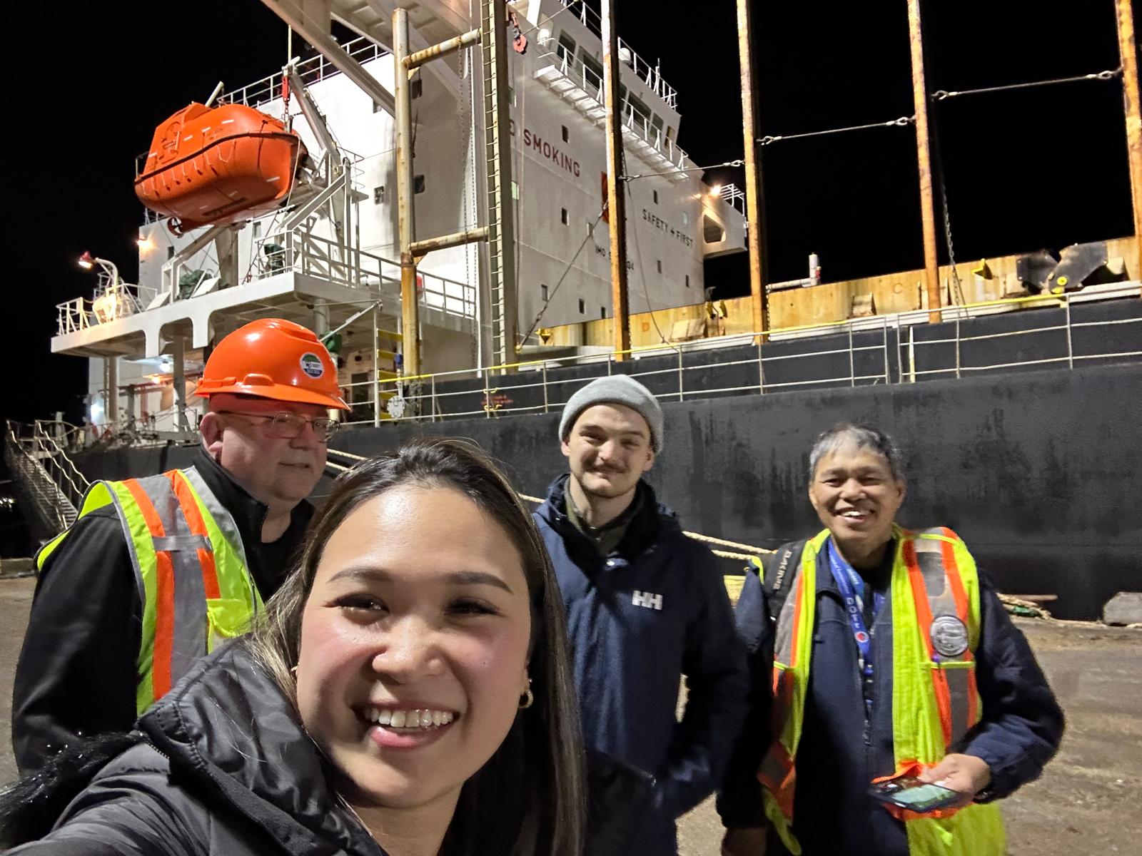 We arrived at the ship around 5:45 and were greeted by the young captain who signed us in. We were led into the ship and entered the crew mess. As is custom, we all removed our footwear and were greeted by a very friendly group of seafarers.