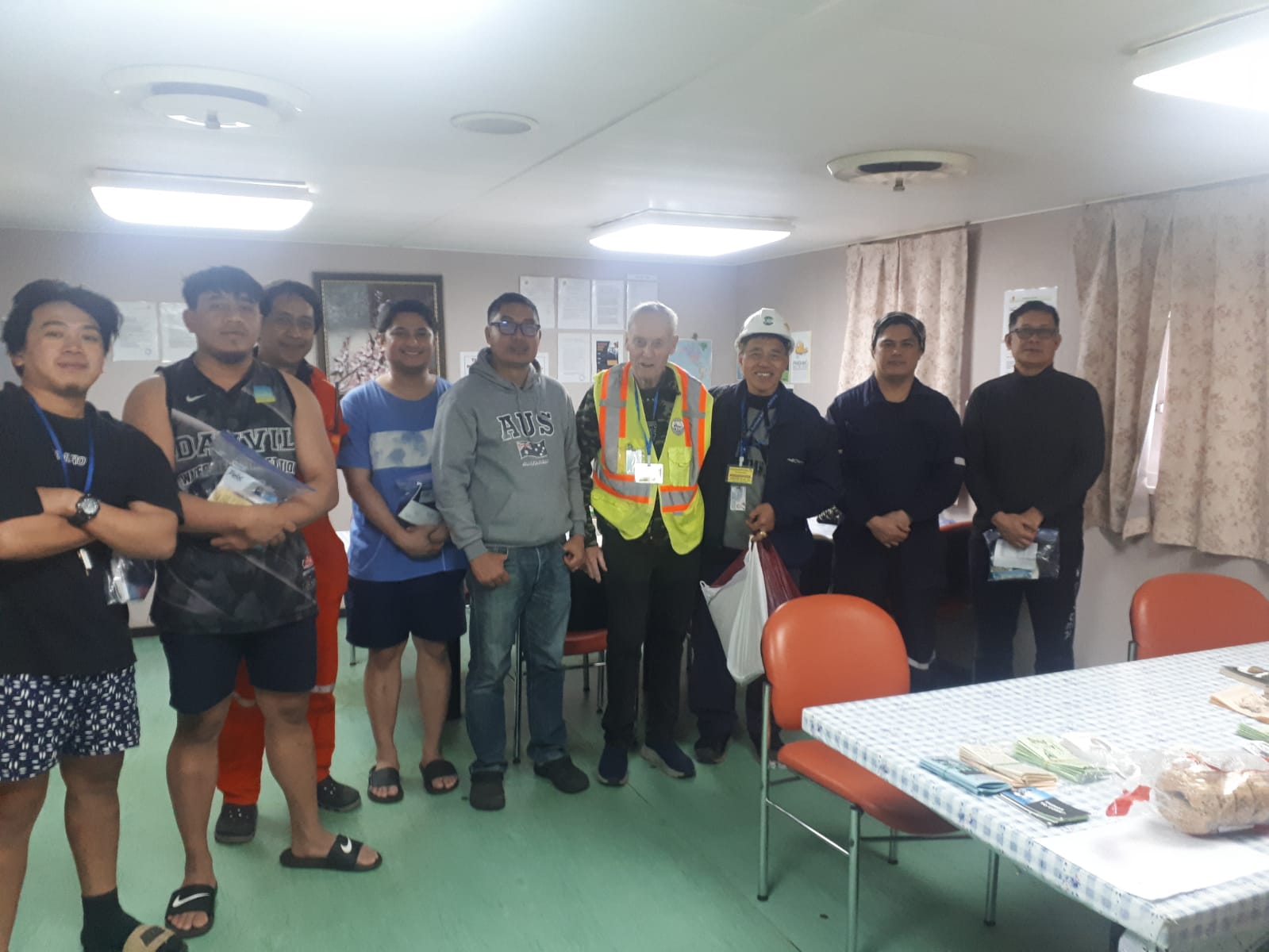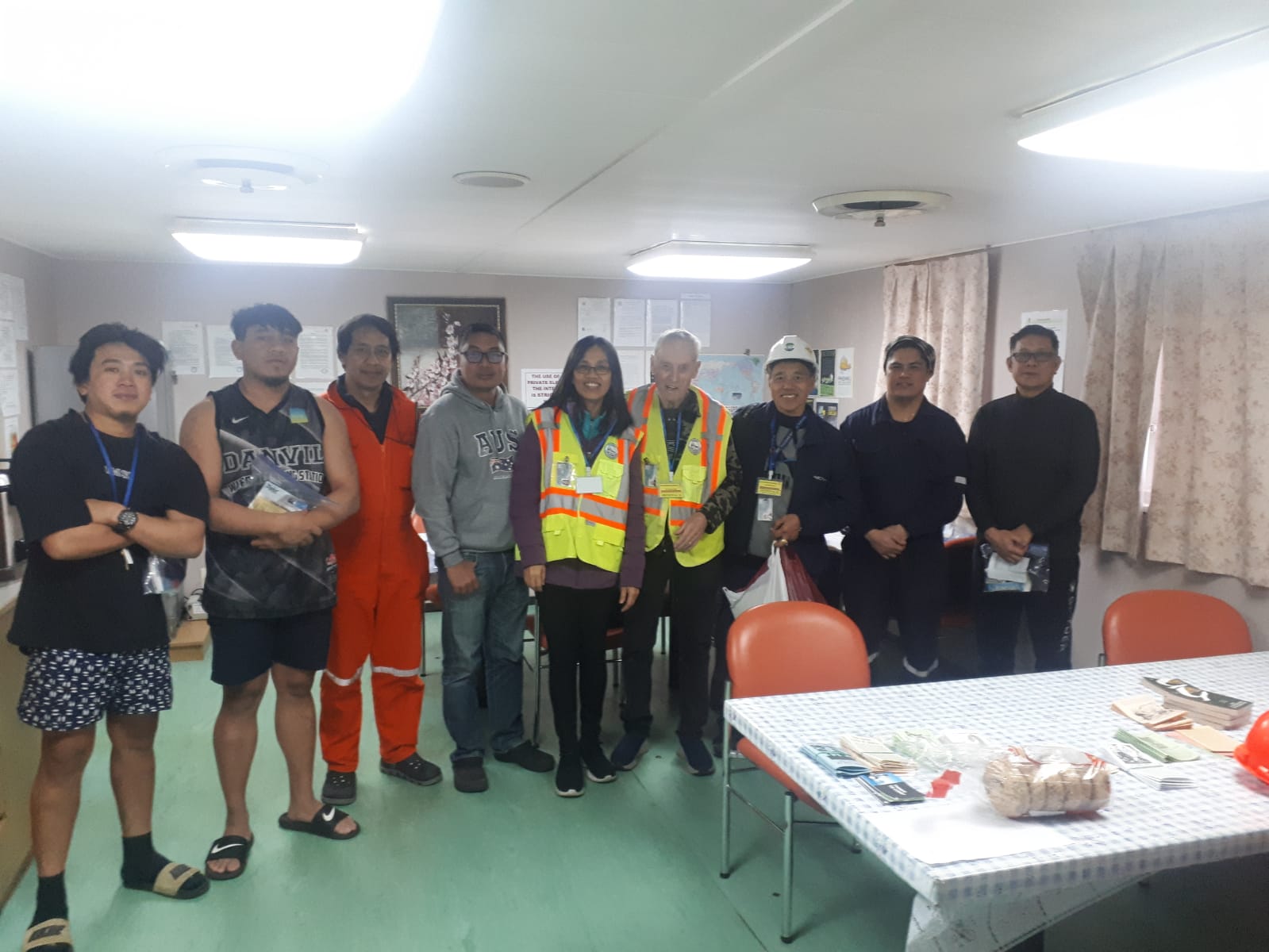 We met at dock security and drove to the ship about 5:30. We checked through deck security and they took us to the crew mess. After visiting the crew for a short while, Gina started preaching the gospel to them. She quoted scripture and shared testimonies, and then I shared as well. We shared John 3:16-36, John 14:6, and Revelation 3:20. Gerard also shared and quoted scripture as well as posting some scriptures for them to look up in their Tagalog New Testaments. When we were finished we prayed for them. Then the captain asked us to pray for the health authority as they had an inspection and were required to do some work in the galley. The final inspection will happen tomorrow and they need to pass this inspection before they can leave.